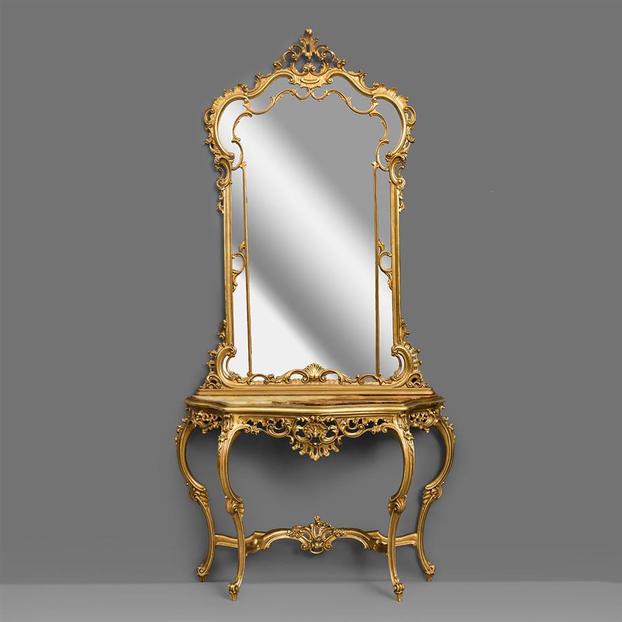 路易十五洛可可风格,山毛榉木框架贴金箔装饰。缟玛瑙桌面,望板雕刻涡卷茛苕,枝形弯腿雕刻卷叶花卉,X形横拉挡中央镂刻扇形涡卷;配套镜框外缘雕刻与桌体呼应的茛苕枝叶。